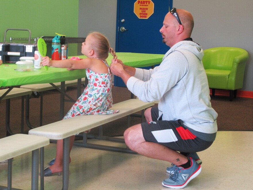 Sherron's free class has a new location every month, and this time it’s in Grove City, where he lives. Each of the three dads here receive a kit to take home, with things like ponytail holders, hair brushes, and detangler.